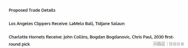 北京时间12月3日,快船与黄蜂有望达成一笔4换2的交易方案。快船送出约翰·柯林斯、博格达诺维奇、克里斯·保罗及2030年无保护首轮选秀权,引进黄蜂核心拉梅洛·鲍尔(三球)与新秀蒂贾恩·萨劳恩,为球队5胜16负的队史最差开局寻求破局。