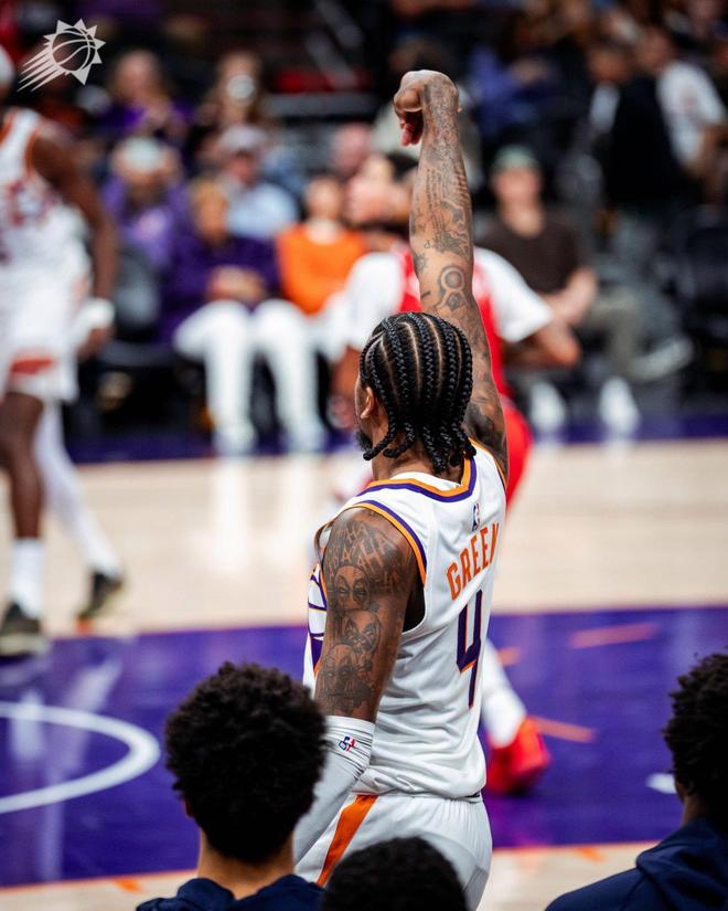 格林太阳首秀就命中了6记三分,刷新了队史纪录。此前纪录是阿里扎、以赛亚-托马斯和蒂姆-托马斯的5记。格林在进攻端的暴走,分担了布克的得分压力。格林的首秀,堪称完美。
